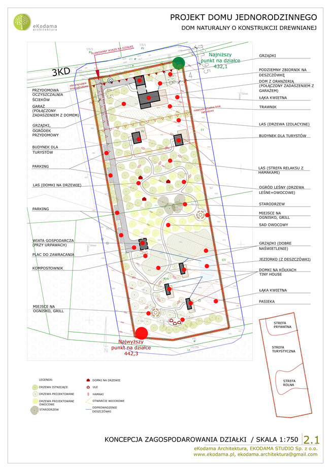 Dom i garaż to dopiero pierwszy etap większej inwestycji agroturystycznej, w której króluje głęboka ekologia i permakultura. Zgodnie z naszą autorską metodą „ekozoning”, przygotowałyśmy masterplan całego założenia, który będzie sukcesywnie realizowany. To nie tylko dom, to początek całego ekosystemu – plan przewiduje budowę naturalnych zbiorników retencyjnych na deszczówkę, kolejnych domków gościnnych oraz tiny house'ów. Powstanie tu leśna wioska z pasieką, łąkami kwietnymi, uprawami leśnymi i grządkami, a także wyjątkowe strefy relaksu dla turystów płynnie połączone z lasem.