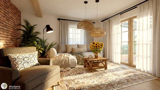 W naszych projektach nie ma miejsca na zimny beton czy toksyczną chemię budowlaną. Zaprojektowałyśmy użycie materiałów, które nie emitują szkodliwych związków do wnętrza i pięknie zachowują się w czasie. Przewidziałyśmy wykończenie ścian tynkami glinianymi i wapiennymi, które budują we wnętrzu niezwykłą miękkość i komfort. Świetnie współgrają one z drewnem – głównym bohaterem tego domu. Zgodnie z projektem oryginalne podłogi zostaną odrestaurowane, aby dom zachował kontakt ze swoją historią. Historyczny dach zyska nowe pokrycie z klasycznej, czerwonej dachówki karpiówki. Z zewnątrz budynek dopełnią drewniane detale (okiennice, deskowanie) oraz szlachetne okładziny z jasnego piaskowca w strefie cokołu i na tarasie, podkreślając jego rustykalny i autentyczny charakter.